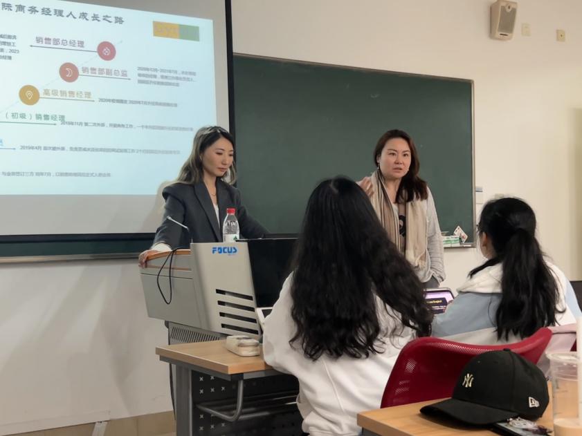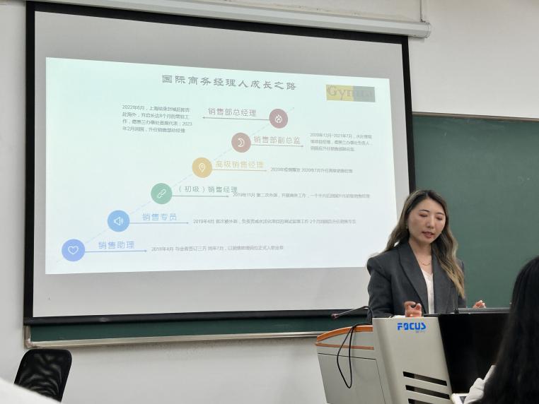 肖亚丽还向同学们分享了自己的工作体验。她提到,海外销售工作具有频繁出差、跨部门合作密切、高挑战性与高回报性并存的特点,既需要跨文化沟通、市场营销、组织计划等能力,也需要对海外运输、贸易法规知识有基本的了解。