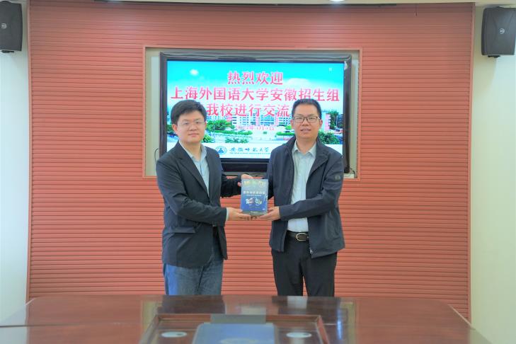 在芜湖一中,一中校党委委员、教务处主任何家传对安徽招生宣传组一行的到来表示热烈欢迎,并介绍了一中的校史、办学理念和学生高考录取情况。何洪武介绍了上海外国语大学的学校概况、专业设置和招生录取情况,并逐一详细介绍了“优秀生源基地”合作建设“八大计划”的基本内容。