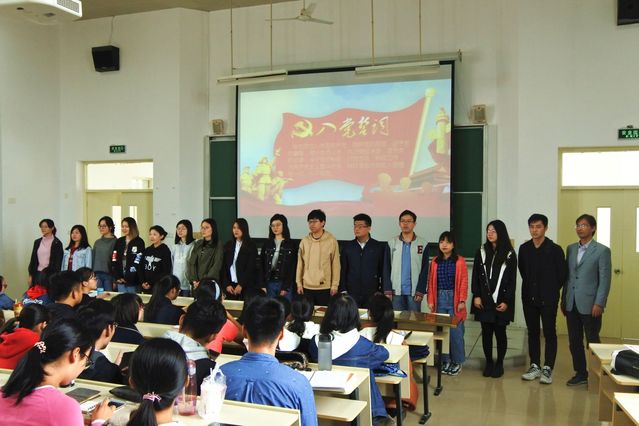 活动伊始,何洪武老师与张守柱老师为“国际教育学院分党校”揭牌。随后,张守柱老师带领上学期入党的学生党员们进行了入党宣誓。党员学生们集体宣读庄重的入党誓词,每字每句都承载着他们对成为一名合格党员的承诺、决心与责任。蒋文家老师宣读了2017级学生第二批入党积极分子的名单,并向大家简要介绍了入党流程。