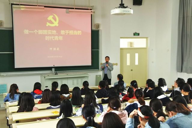 随后,何洪武老师为分党校上了第一堂党课,他以《做一个脚踏实地,敢于担当的时代青年》为题,与同学们分享了大学生如何在新时代保持并激发勤于奉献、敢于担当、勇于创新的朝气与斗志。何老师以习近平总书记在北京大学师生座谈会上的讲话为导语进行展开,勉励大家在学习生活中要注重细节,脚踏实地,积极践行社会主义核心价值观,并通过钱学森、南仁东、施一公、黄大年等优秀共产党员的先进事迹激励同学们坚持心系祖国的青春梦想,鼓励大家要勇于探索,敢于实践,牢记青年一代的使命担当与时代责任,夯实学业基础,将来报效国家。