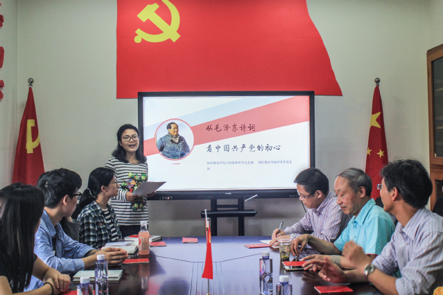 5月22日,国际教育学院本科生党支部和研究生党支部在学院“党员之家”联合开展主题党日活动,本次活动的主题是“从毛泽东诗词看中国共产党的初心”。党总支书记何洪武、特邀党建组织员沈志强、党总支副书记张守柱参加活动。